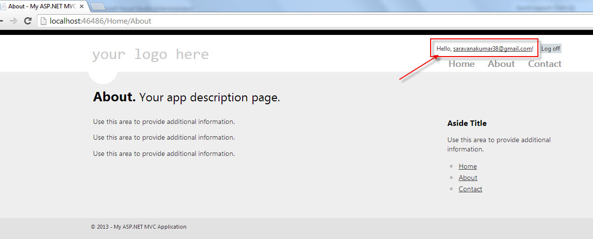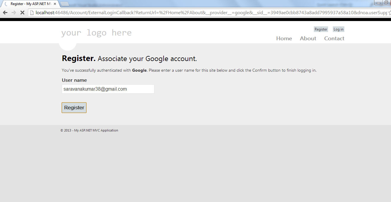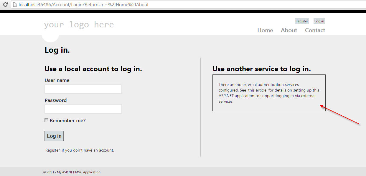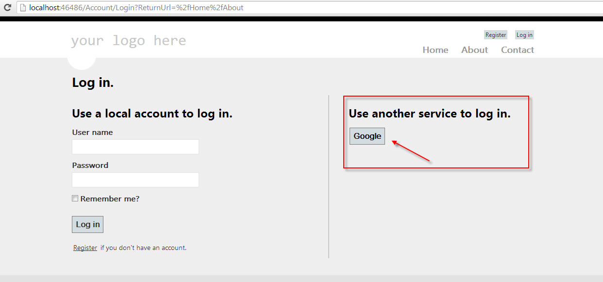 Uncommented the Google web security in “\App_Start\AuthConfig.cs”. Run the application to diplay another login service added to login screen.
