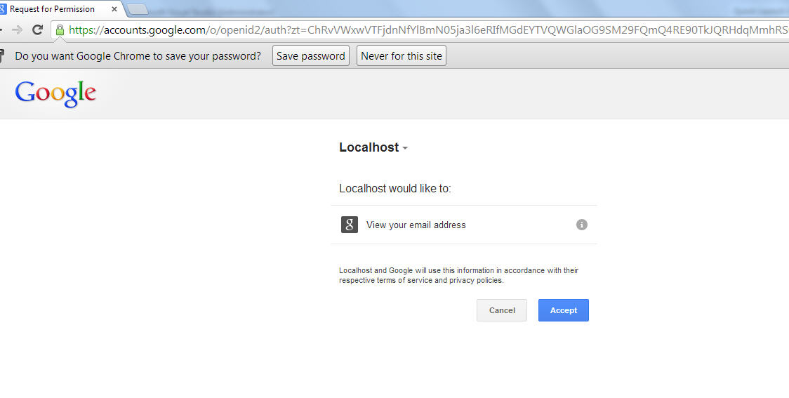 After authentication by Google service, it will request you to allow your site to access the Google credential.